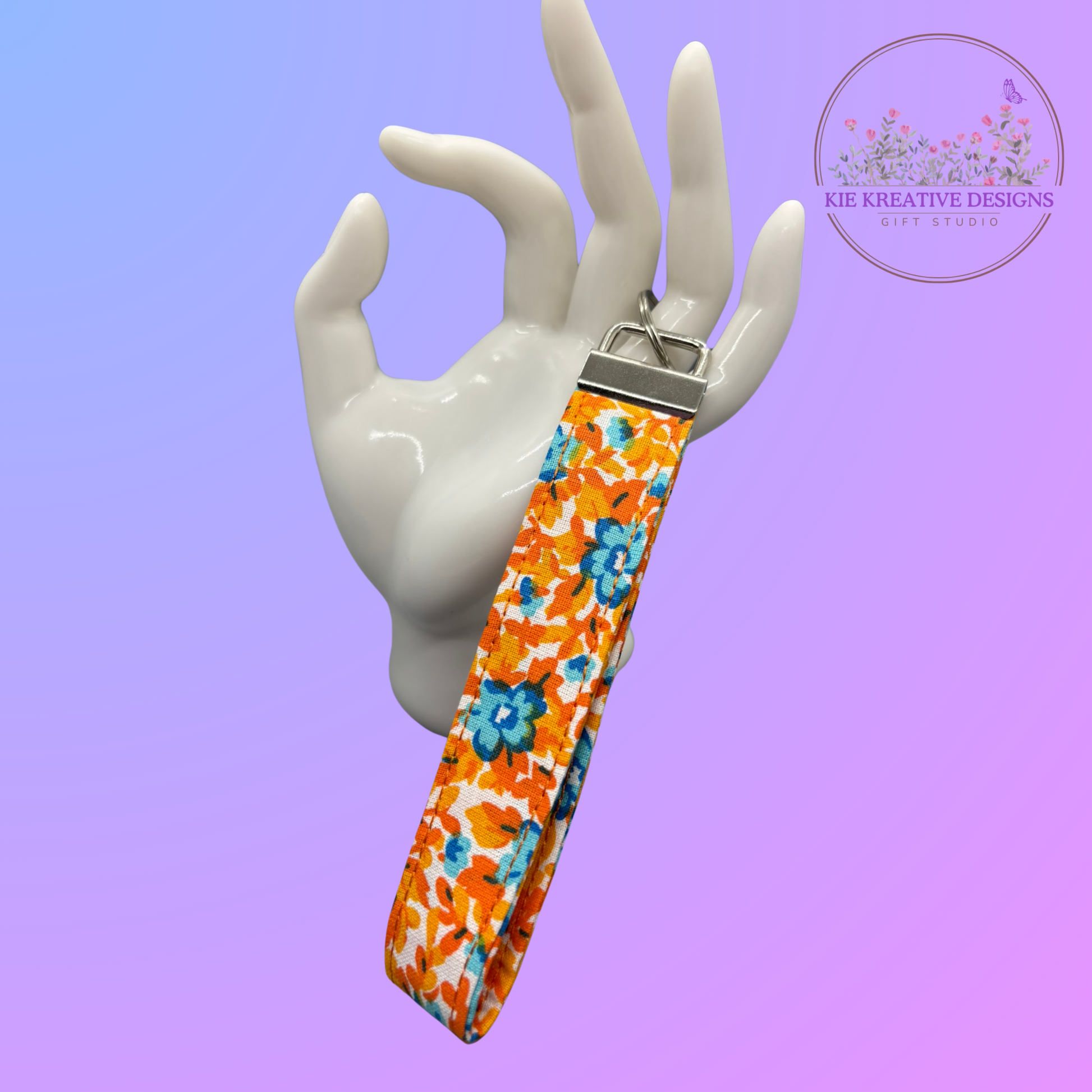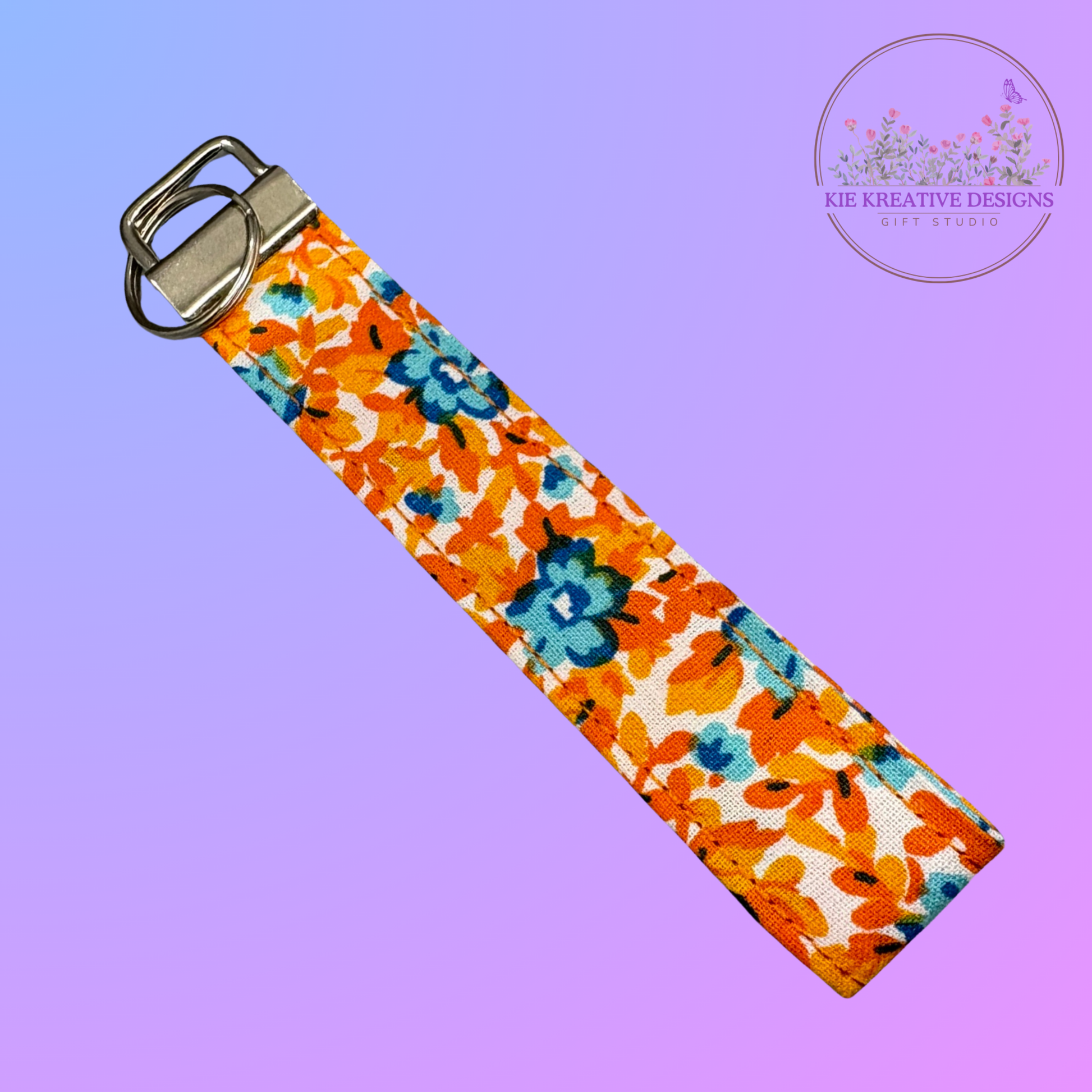 Bring a burst of color and convenience to your everyday routine with this handmade fabric wristlet keychain. Featuring a vibrant orange floral pattern with blue blossoms, this wristlet keeps your keys stylishly close at hand—perfect for errands, school runs, or workdays.